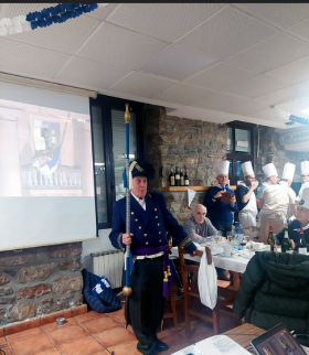 Y con las copas en la mano, son las 11,30 horas, hay que empezar a preparar los elementos principales de la fiesta. Se distribuye a todos los asistentes el correspondiente kit de tamborrada (gorro, tablita y palillos), al mismo tiempo que los tamborreros y tamborreras “titulares”, más otros y otras que se apuntan, se aprestan a ponerse el delantal y gorro oficiales y a coger sus instrumentos de trabajo. Hoy es importante destacar la presencia de un compañero, ausente los últimos años, pero que es un verdadero “comodín” en la fiesta y no es otro que Javier Goldaracena, que se encarga de montar la bandera en su mástil y dejarla preparada para izarla en su momento, así como dar los últimos toques a la vestimenta del Tambor Mayor, Manolo García, para que el uniforme oficial del Ingeniero reluzca con todo su esplendor. Y, por otra parte, Luis Larrea, bien ayudado por el equipo técnico, se encarga del montaje audiovisual.